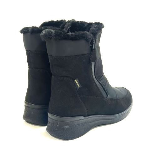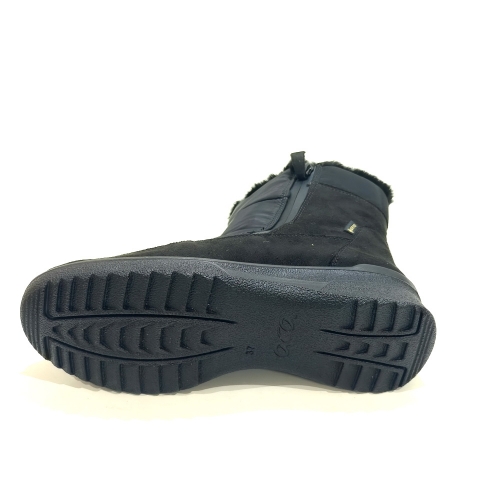 Botín con cremallera lateral, fabricado en serraje y tela, con forro de pelo, plantillas extraíbles y suela de goma