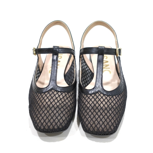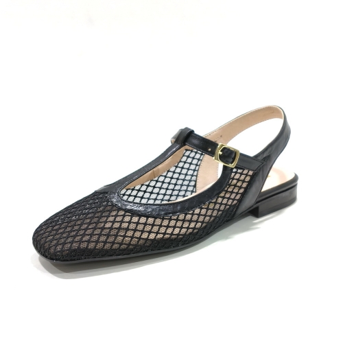 Zapato descubierto de talón, fabricado en maya textil con interior de piel, con suela de goma