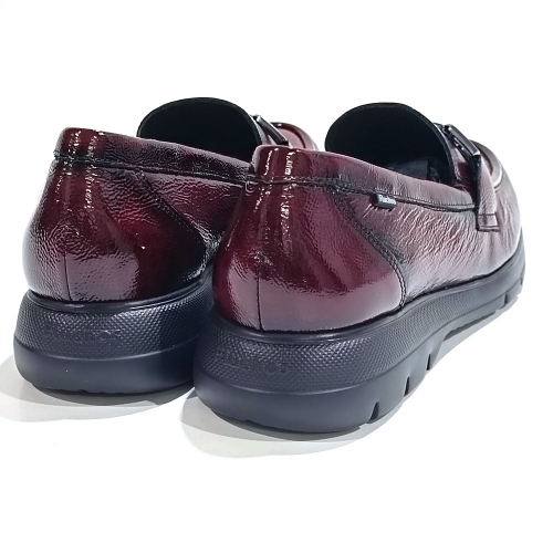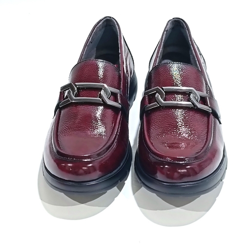 Zapato mocasín con estribo metálico, fabricado en charol , con suela de goma