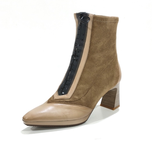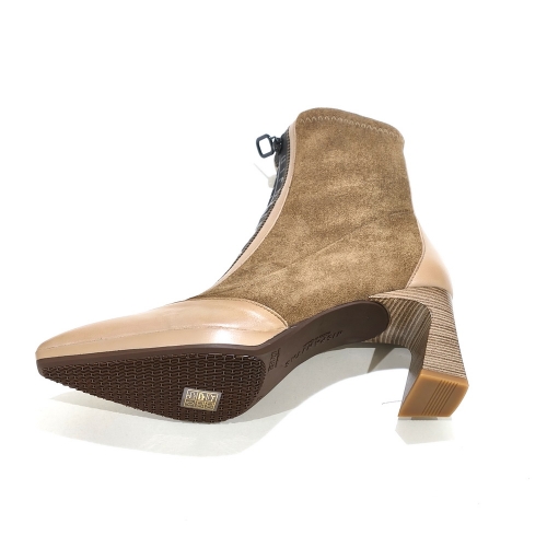 Botín con cremallera central, fabricado en piel y licra elástica, con tacón de 6 cm y suela de goma