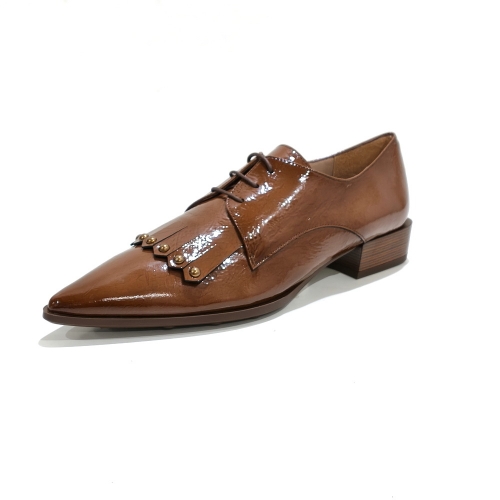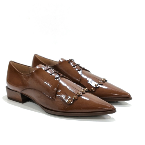 Zapato de cordoneras con flecos, fabricado en charol, con tacón de 2 cm y suela de goma