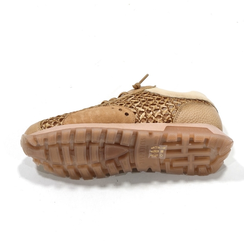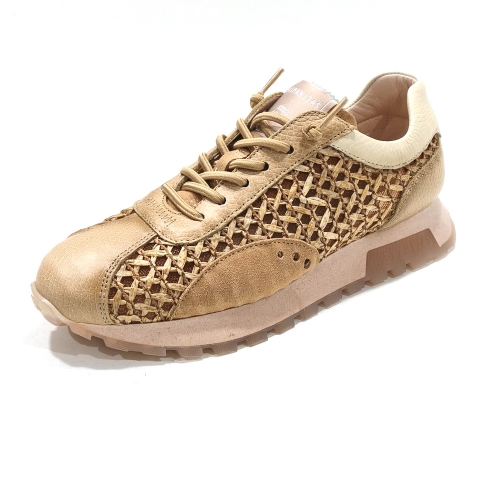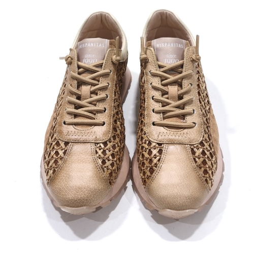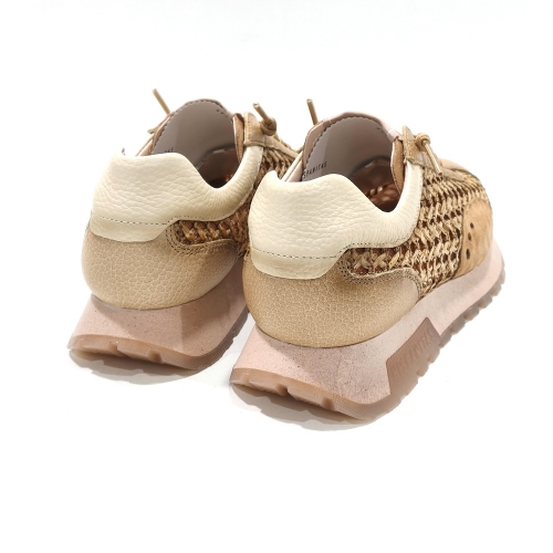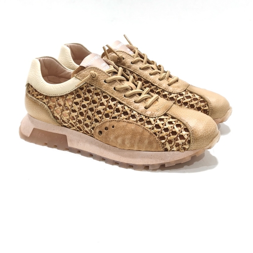 Zapato de cordoneras elásticas, fabricado en piel y rafia trenzada, con plantillas extraíbles y suela de goma