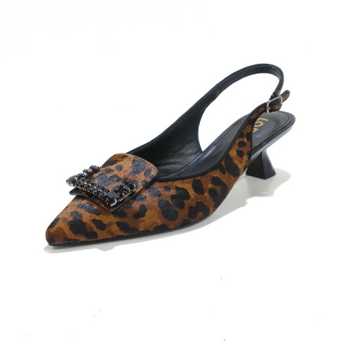 Zapato descubierto de talón con adorno en la cara, fabricado en piel animal print, con tacón de 4 cm