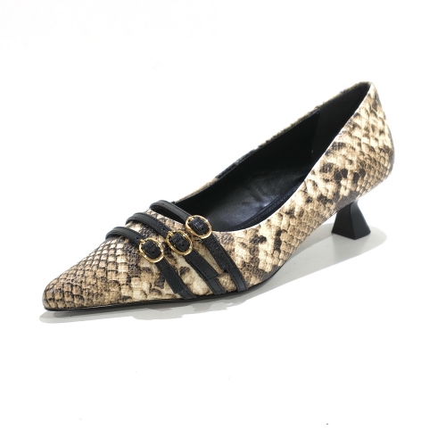 Zapato corte salón con tres hebillas, fabricado en piel animal print, con tacón de 3 cm y suela de goma