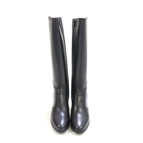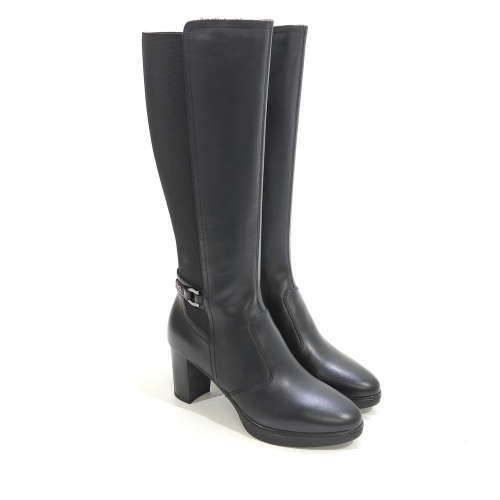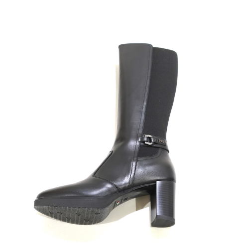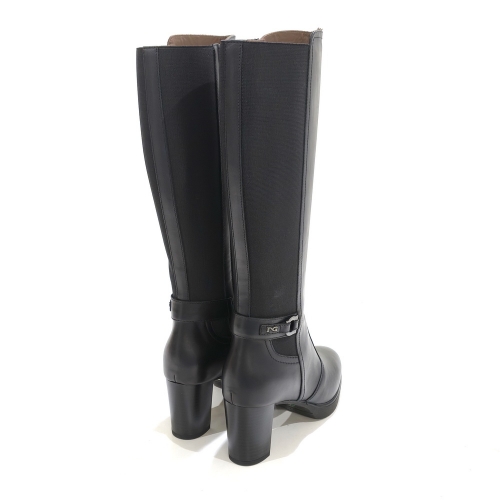 Bota negra con cremallera lateral y hebilla, fabricada en piel y elástico, con tacón de 7 cm y plataforma de 1.5 cm