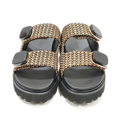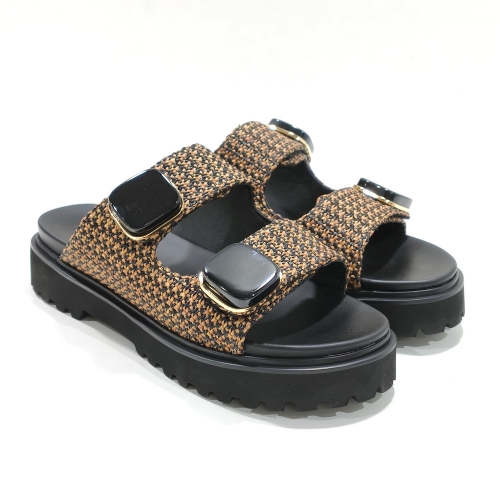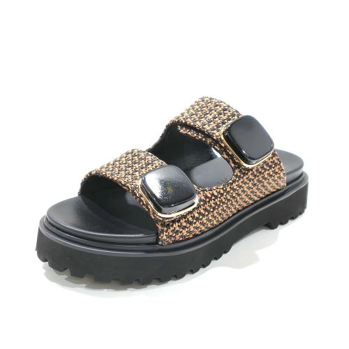 Sandalia de dos tiras ajustable con cinta textil adhesiva con adornos, fabricada en textil, con plataforma de 2 cm de goma