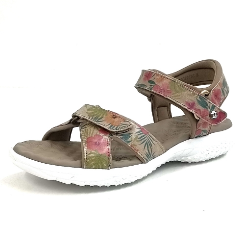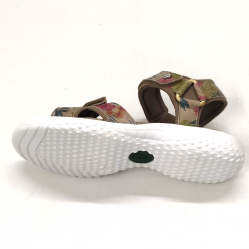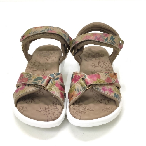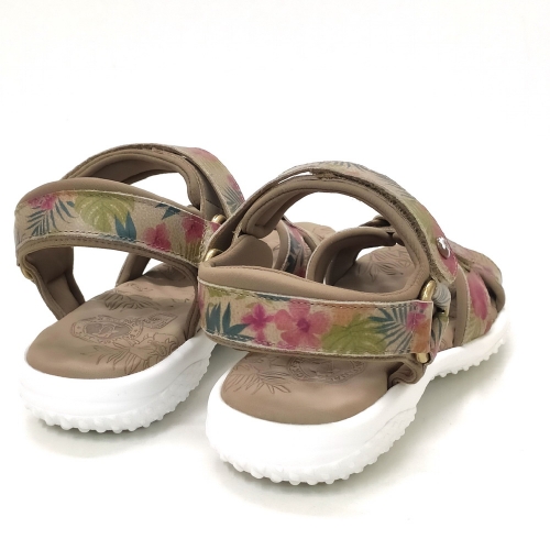 Sandalia plana con tiras ajustables con velcro, fabricada en piel con estampado de flores