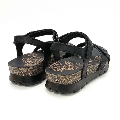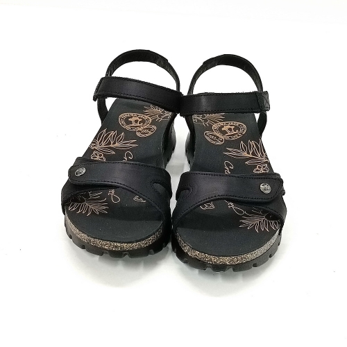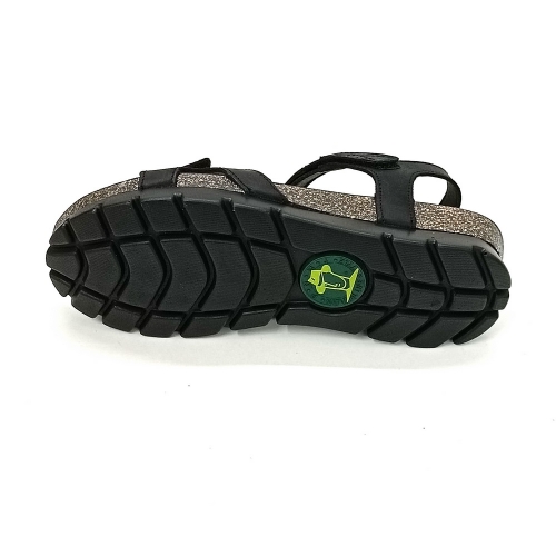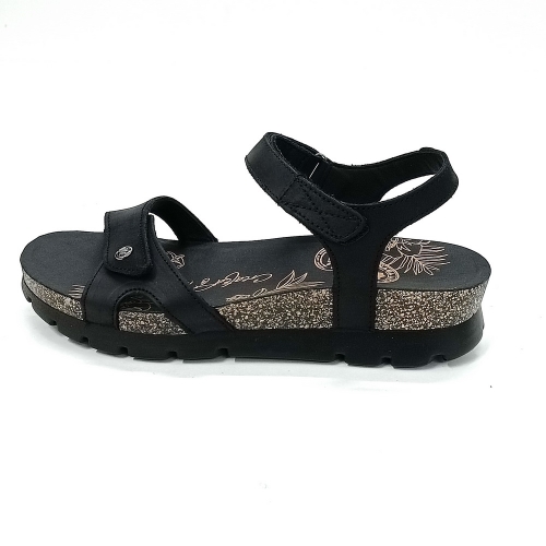 Sandalia con tiras ajustables con velcro, fabricada en piel negra con plataforma de corcho de 3 cm