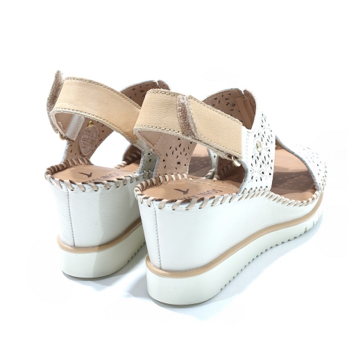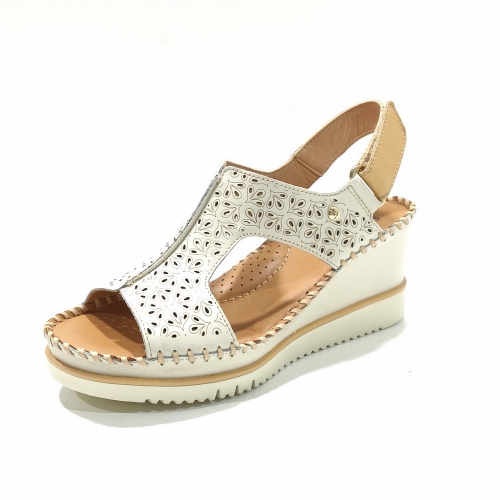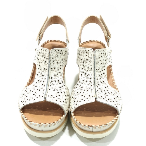 Sandalia abotinada con cierre de cinta textil adhesiva, fabricada en piel troquelada, con cuña de 4 cm y suela de goma