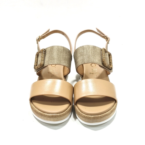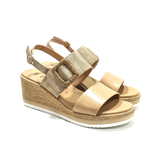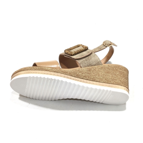 Sandalia de tiras ajustables  con cinta textil adhesivas, con cuña de goma de 5 cm