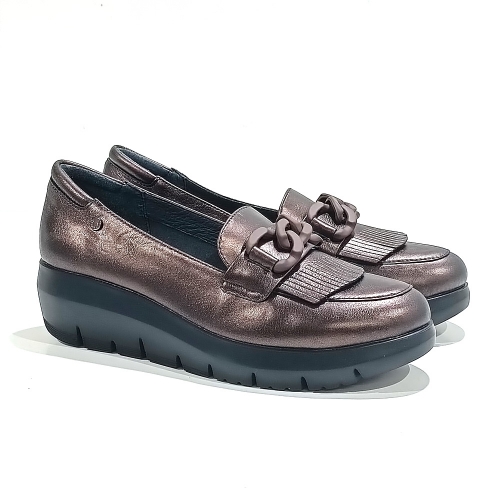 Zapato mocasín con estribo y flecos, fabricado en piel, con cuña de 4 cm