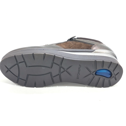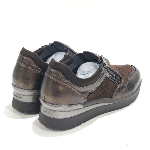 Zapato abotinado con cremallera lateral, fabricado en ante y piel, con plantillas extraíbles y cuña de goma de 3 cm