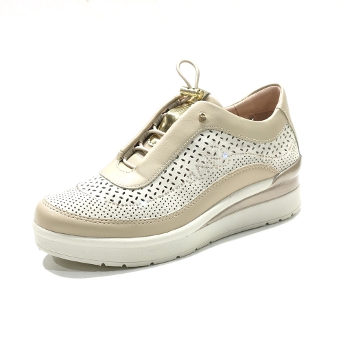 Zapato con cordones elásticos, fabricado en piel troquelada, con plantillas extraíbles y cuña de goma de 3 cm con sistema bluesoft