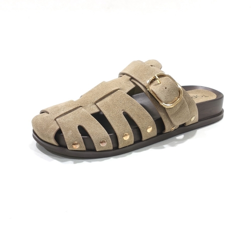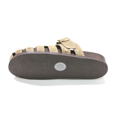 Zueco con hebilla, fabricado en serraje con tachas metálicas, con suela de goma