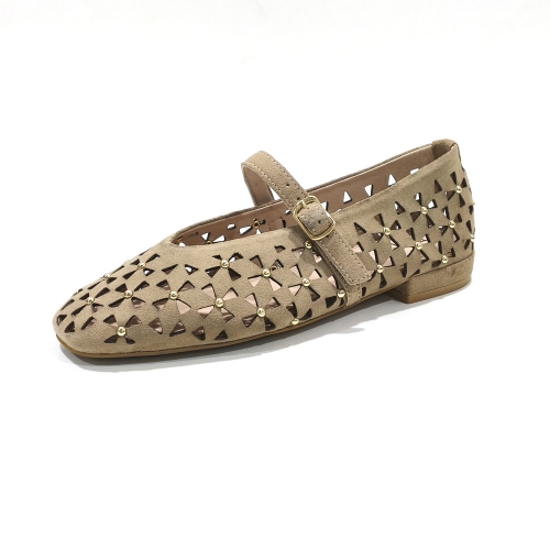 Sabrina plana fabricada en nobuk troquelado, con suela de goma