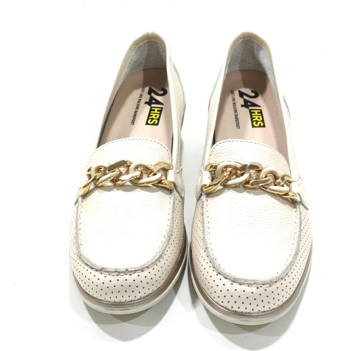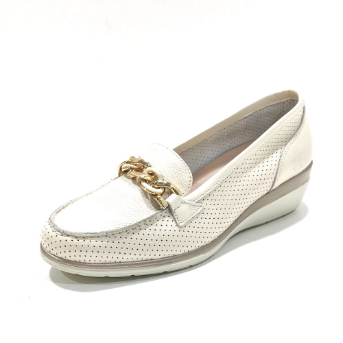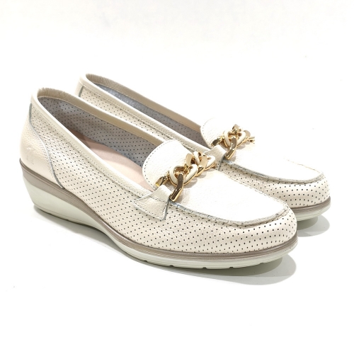 Zapato mocasín con adorno en la cara , fabricado en piel picada , con cuña de goma de 3 cm