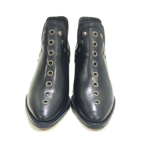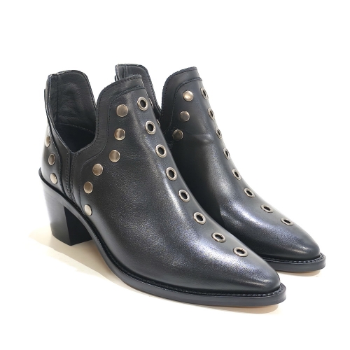 Botín corto, fabricado en piel, con tachas metálicas, con tacón de 4 cm