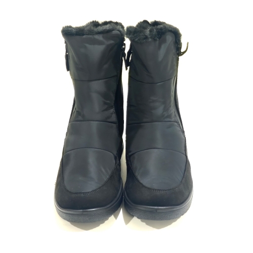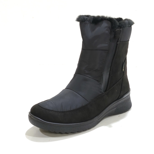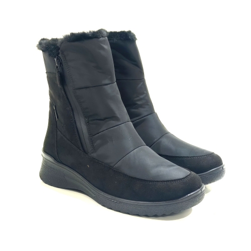 Botín con cremallera lateral, fabricado en serraje y tela, con forro de pelo, plantillas extraíbles y suela de goma