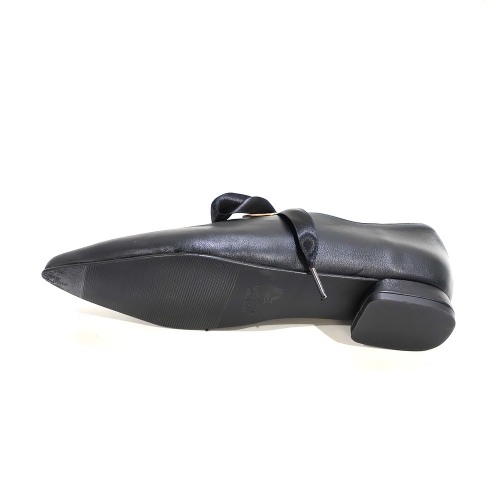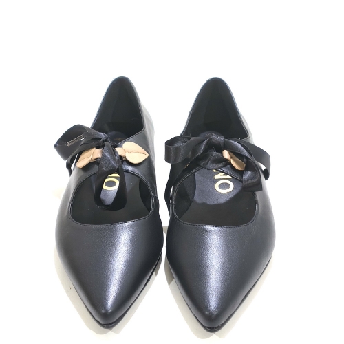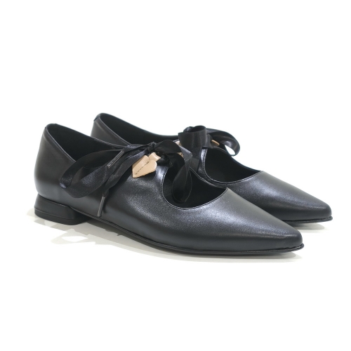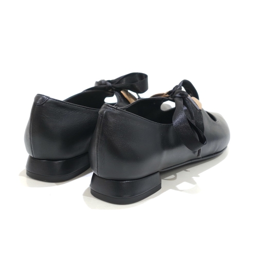 Zapato plano con lazo de raso, fabricado en piel, con suela de goma
