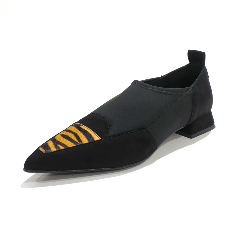 Zapato abotinado, fabricado en licra, ante y piel animal print, con tacón de 2 cm y suela de goma
