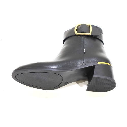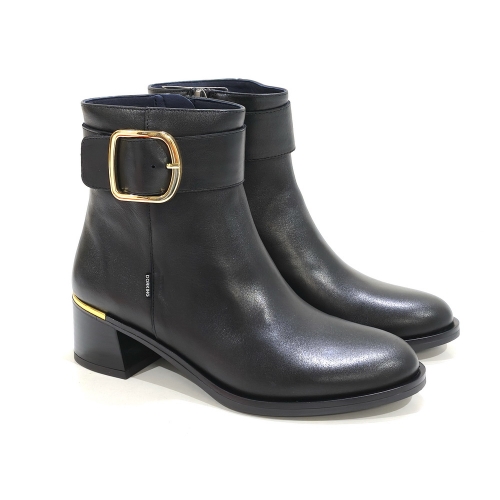 Botín con cremallera lateral y hebilla metálica, fabricado en piel, con tacón de 5 cm y suela de goma