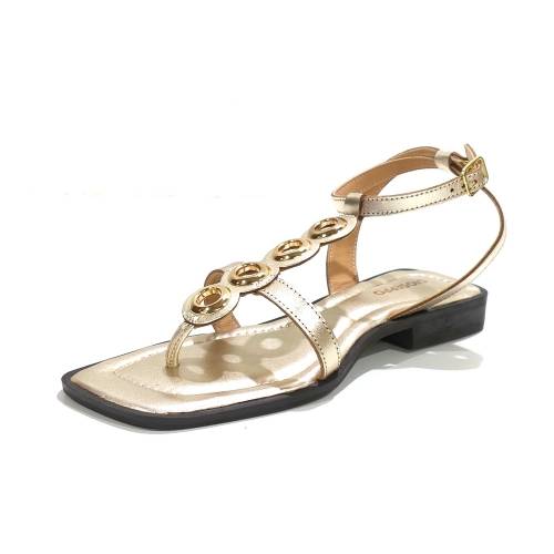 Sandalia de dedo con adornos metálicos, fabricada en piel, con suela de goma