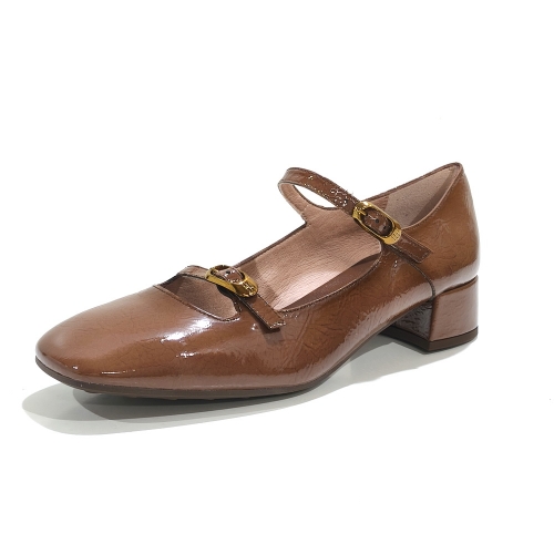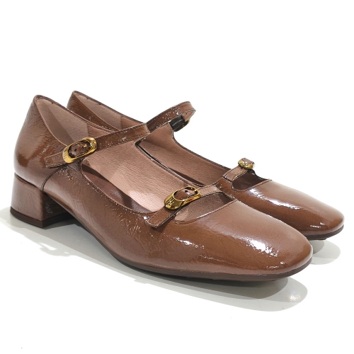 Zapato corte salón con dos tiras con hebillas, fabricado en charol, con tacón de 3 cm y suela de goma