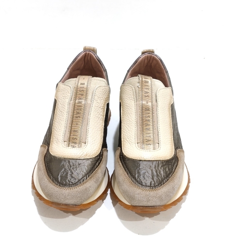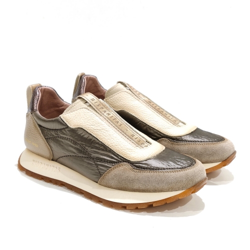 Zapato abotinado con elástico en el empeine, fabricado en serraje y tela, con plantillas extraíbles y suela de goma