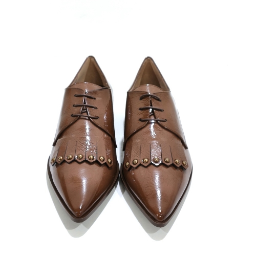 Zapato de cordoneras con flecos, fabricado en charol, con tacón de 2 cm y suela de goma
