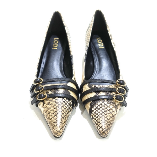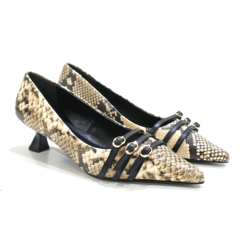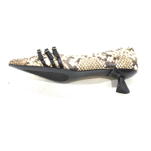Zapato corte salón con tres hebillas, fabricado en piel animal print, con tacón de 3 cm y suela de goma