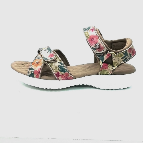 Sandalia plana con tiras ajustables con velcro, fabricada en piel con estampado de flores
