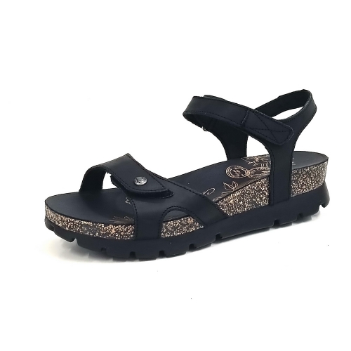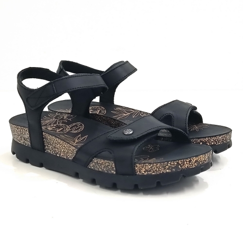 Sandalia con tiras ajustables con velcro, fabricada en piel negra con plataforma de corcho de 3 cm
