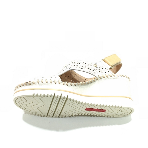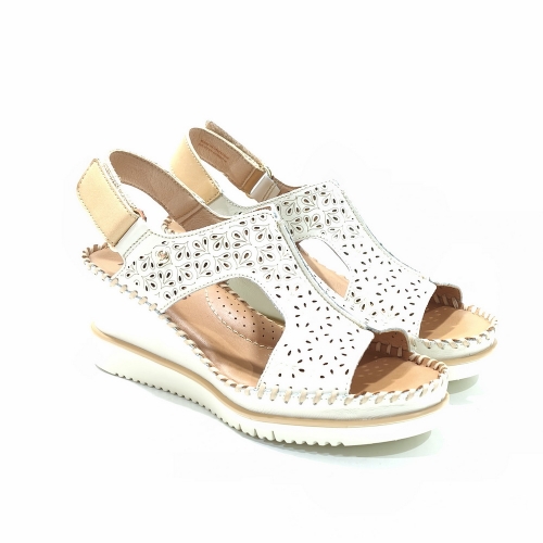 Sandalia abotinada con cierre de cinta textil adhesiva, fabricada en piel troquelada, con cuña de 4 cm y suela de goma