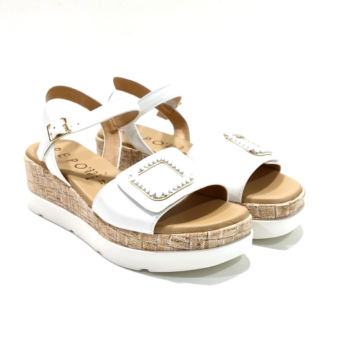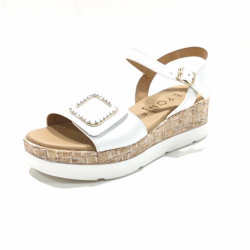 Sandalia con tira ajustable con cinta textil adhesiva, fabricada en piel con adorno en la cara, con cuña de 5 cm y plataforma de 2 cm