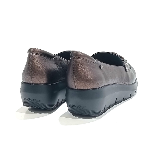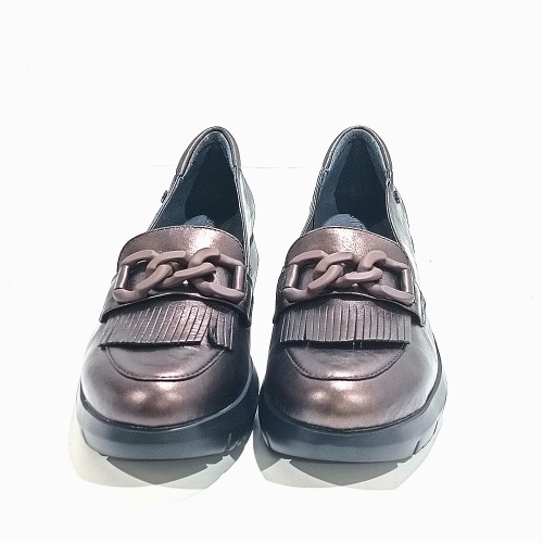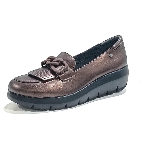 Zapato mocasín con estribo y flecos, fabricado en piel, con cuña de 4 cm