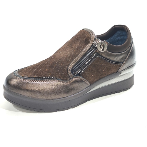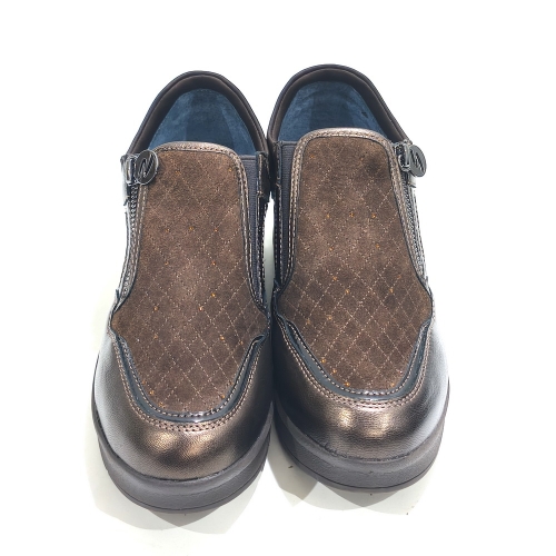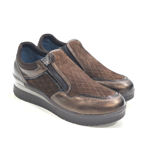 Zapato abotinado con cremallera lateral, fabricado en ante y piel, con plantillas extraíbles y cuña de goma de 3 cm