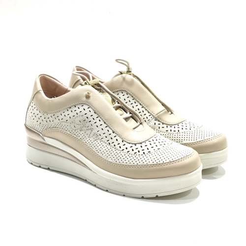 Zapato con cordones elásticos, fabricado en piel troquelada, con plantillas extraíbles y cuña de goma de 3 cm con sistema bluesoft