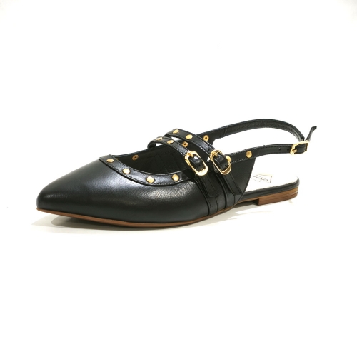 Zapato descubierto de talón, fabricado en piel con tachas metálicas y suela de goma