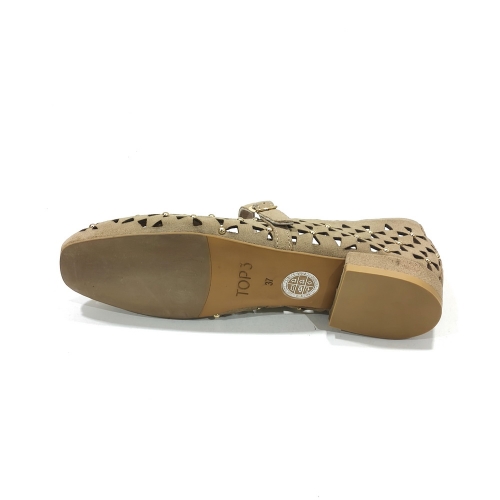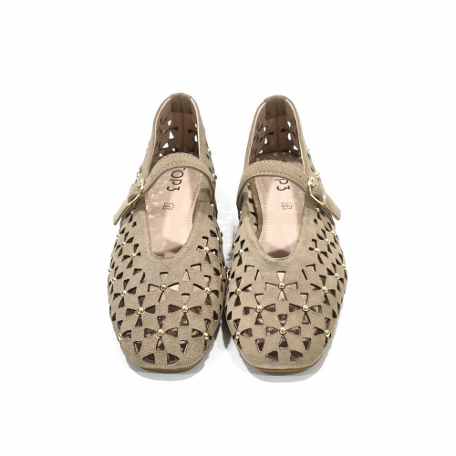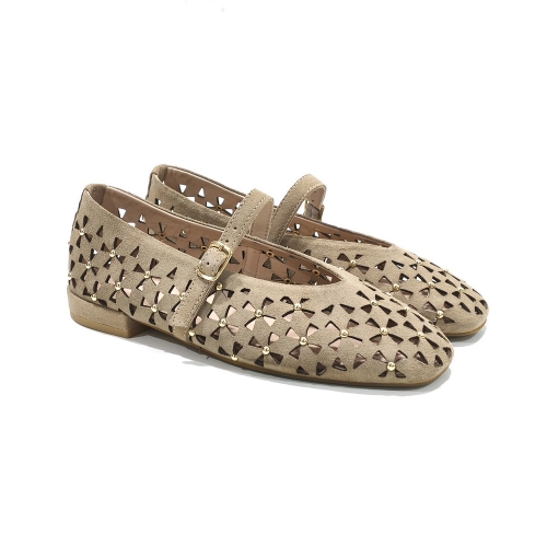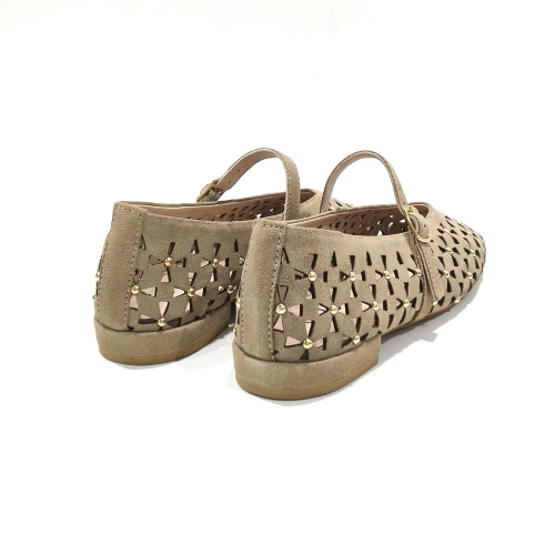 Sabrina plana fabricada en nobuk troquelado, con suela de goma