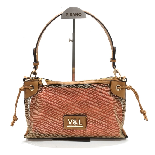 Bolso con asa corta, fabricado en material sintético con bolsa interior de tela, de medidas aproximadas de 29 cm x 19 cm